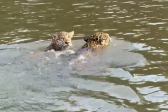 Uma família de onças-pintadas, composta pela mãe e pelo filhote, foi vista…