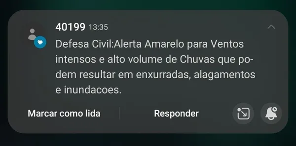 Segundo a mensagem, os ventos intensos e o alto volume de chuvas podem causar enxurradas, alagamentos e inundações em regiões do estado.