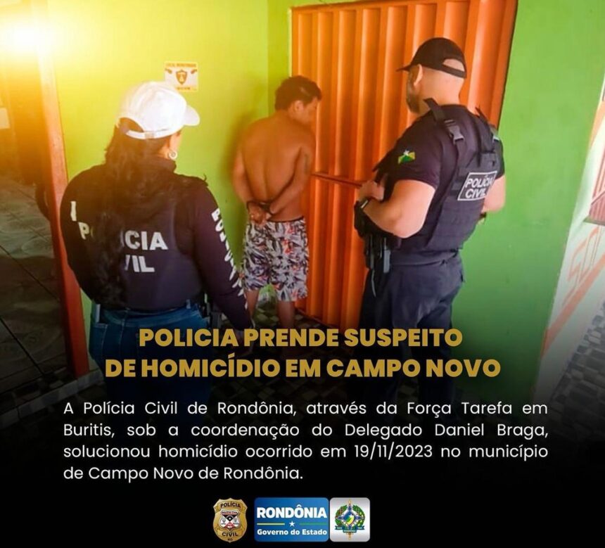 A Polícia Civil de Rondônia, através da Forca Tarefa Buritis, sob a coordenação do Delegado Daniel Braga, solucionou homicídio ocorrido em 19/11/2023 no municipio de Campo Novo de Rondônia. Logo após o crime, foram iniciadas as investigações, que resultaram a identificação dos suspeitos, vindo então, nesta manhä (30/11) a ser cumprido o mandado de prisão em desfavor de F.A.L.. Durante as buscas, também foi apreendido mais de 1.000 kg de minério, aparentando ser cassiterita, que também foram apresentados na Delegacia de Buritis.